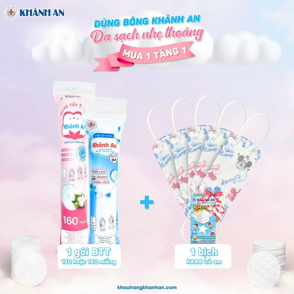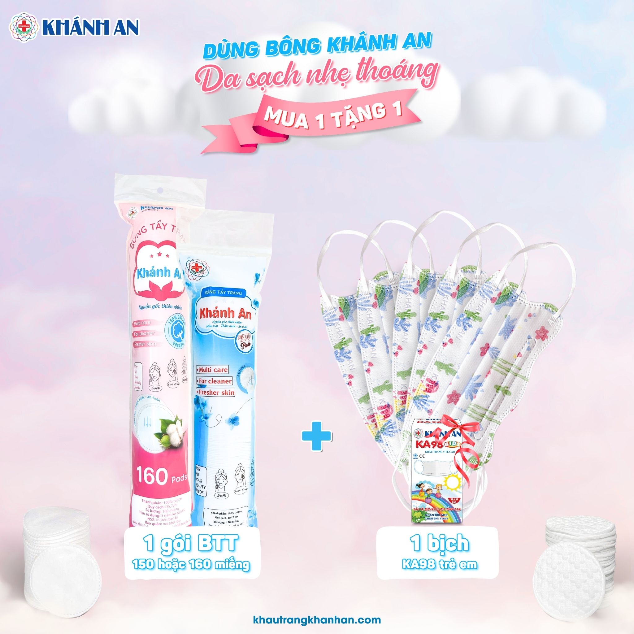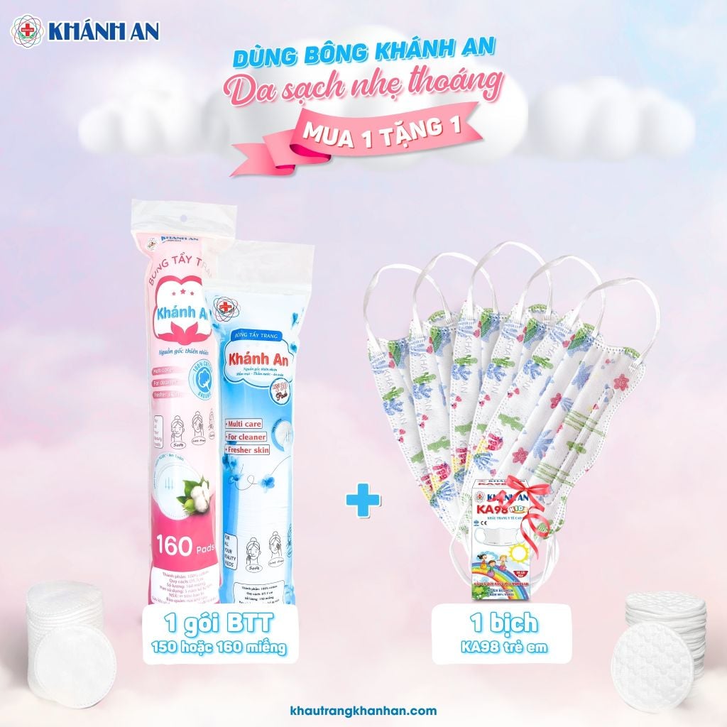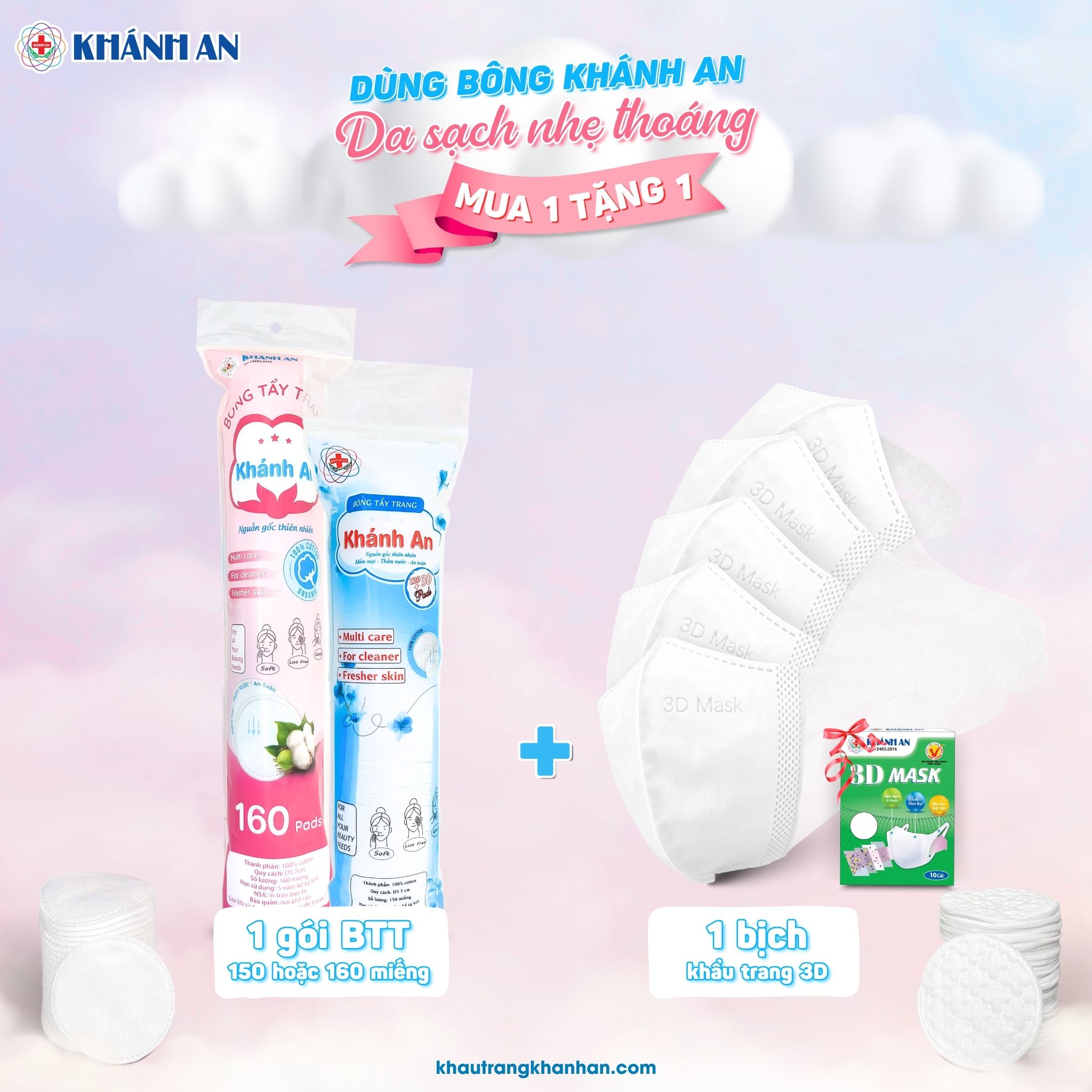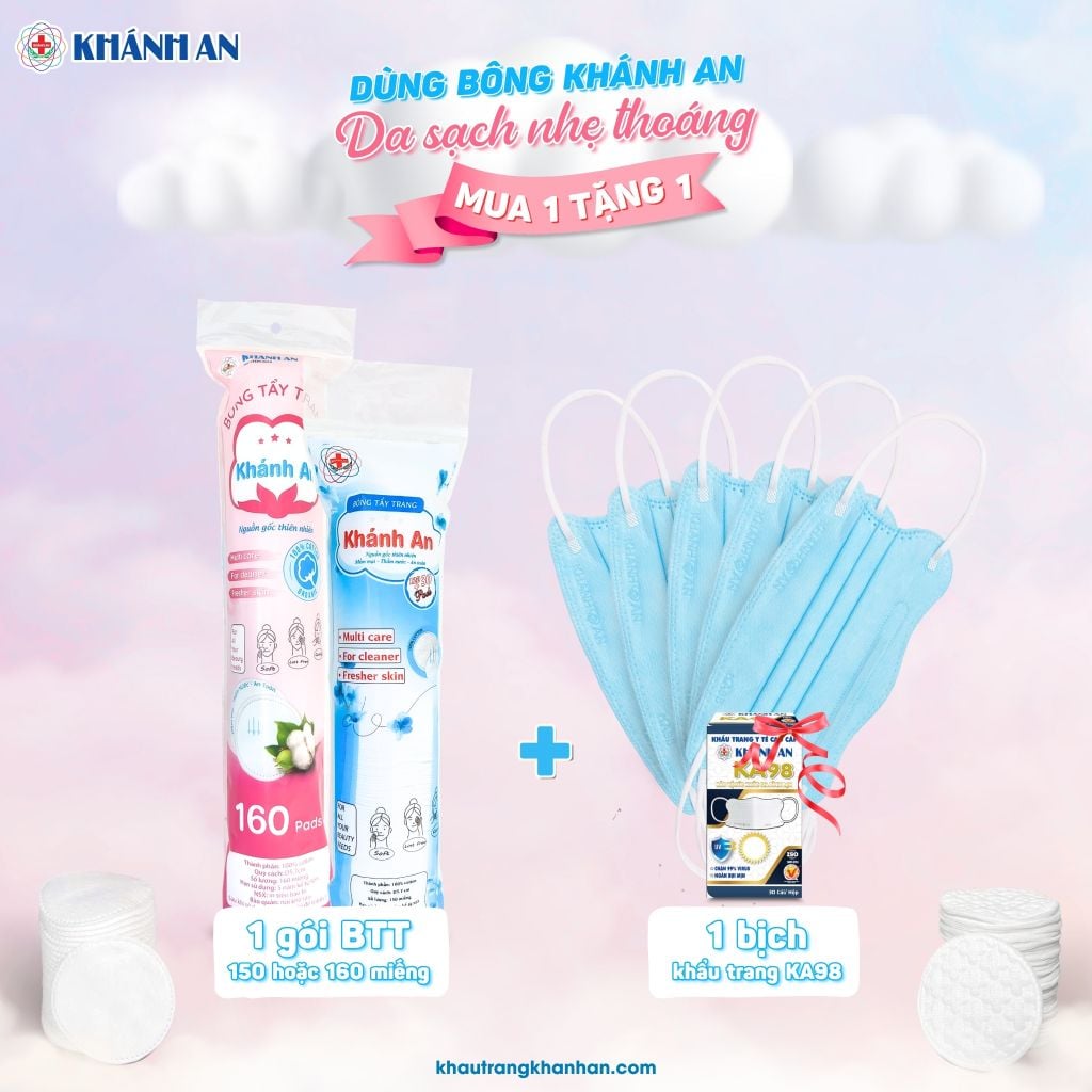 Từ ngày 23.6.2025 - Tặng ngày 1 bịch khẩu trang (5 cái) khi mua 1 gói Bông tẩy trang 160 hoặc 150 miếng.
